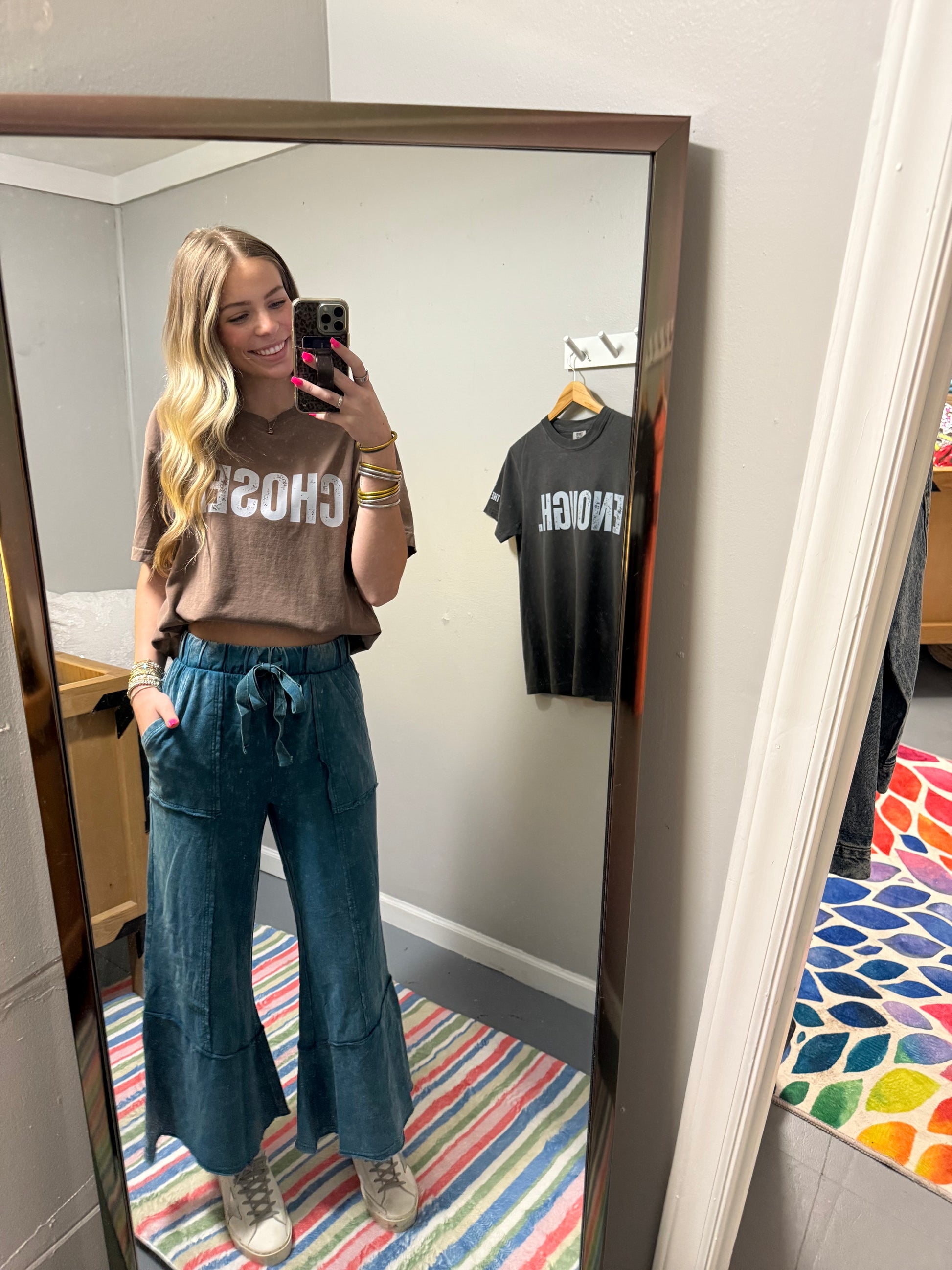 These Exposed Hem Flare Pants are the perfect blend of comfort and style. The loose, oversized fit is complemented by an elastic waistband and drawstring for a personalized fit. The exposed hem adds a unique touch to these pants, which are true to size. Upgrade your wardrobe with this must-have piece.